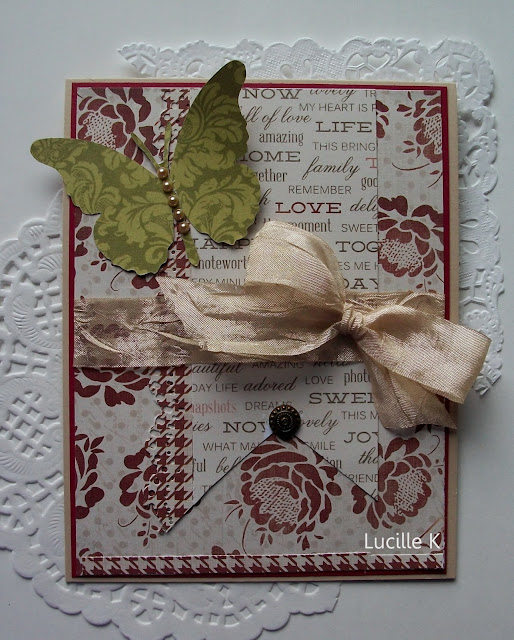 This card I made with a special girlfriend of mine in mind. I used a light blue tissue paper over white card stock. The flowers were a rub-on. I placed it on cream card stock and cut it out. Then using dimensions tabs put it on the card. I love cutting things out and it is just another way of using rub-ons
